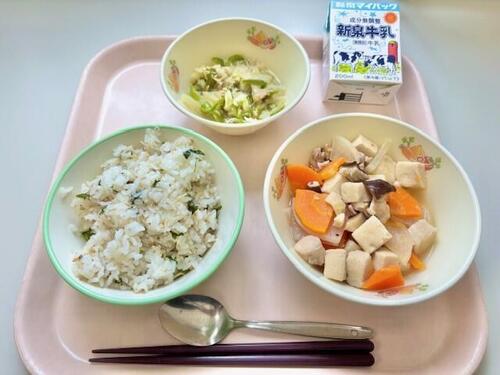 かぶらごはん、高野豆腐の煮物、ツナとピーマンの炒め物、牛乳