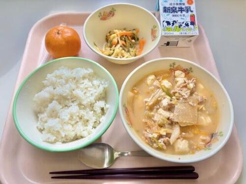 ごはん、みそチゲ、バンバンジーサラダ、みかん、牛乳