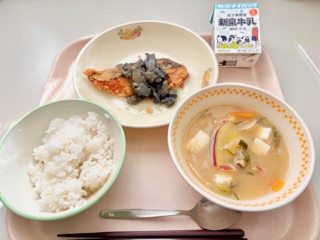 ごはん、鮭と揚げナスのみぞれ煮、さつまいものみそ汁、牛乳