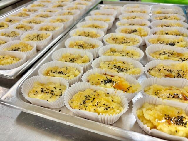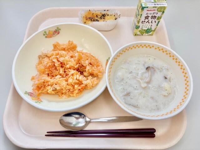チキンライス、きのこクリームスープ、スイートポテト、野菜ジュース