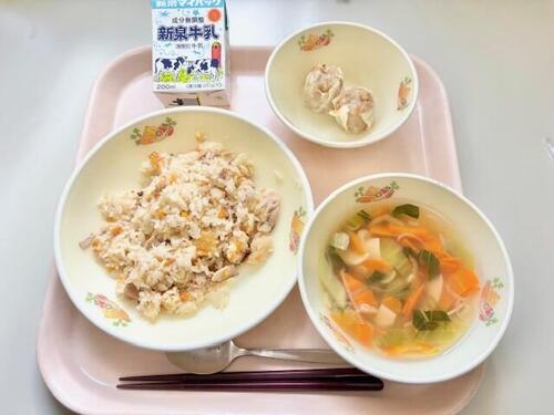 チャーハン、蒸しシューマイ、ビーフンスープ、牛乳
