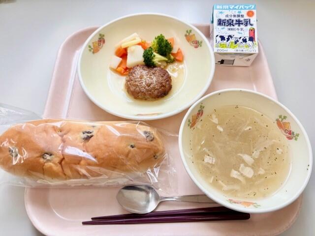 レーズンパン、ハンバーグ、温野菜、オニオンスープ、牛乳