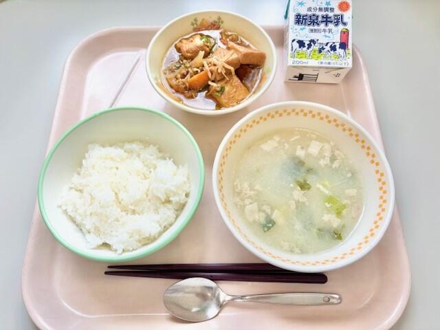 ごはん、厚揚げのそぼろみそ炒め、かぶの豆乳スープ、牛乳