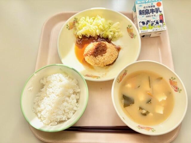 ごはん、とんかつ、ボイルキャベツ、豆腐とわかめのみそ汁、牛乳