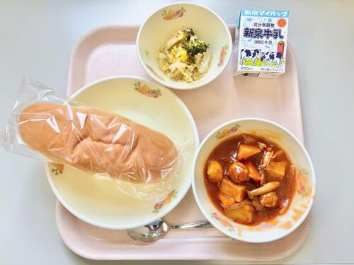 コッペパン、ミートボールシチュー、ツナサラダ、牛乳