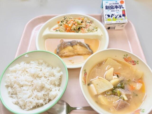 ごはん、カレイの煮つけ、小松菜の白和え、豚汁、牛乳