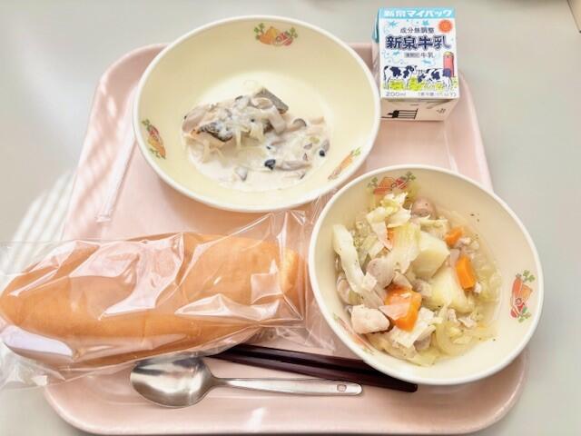 コッペパン、タラのきのこクリームソース、ポトフ、牛乳