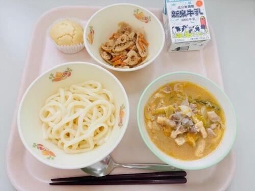 冬至うどん、れんこんのきんぴら、ゆず蒸しパン、牛乳