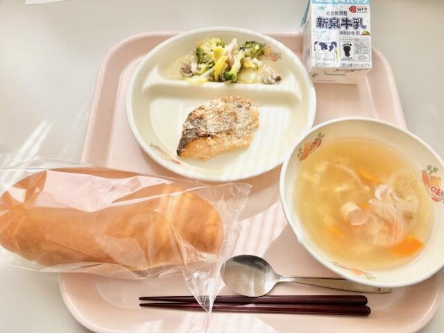 コッペパン、鰆のパン粉焼き、ブロッコリーのソテー、ABCスープ、牛乳