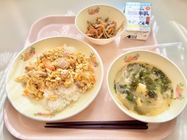 ふわとろおやこキムチ丼、きんぴらごぼう、とうふとわかめのみそ汁、牛乳