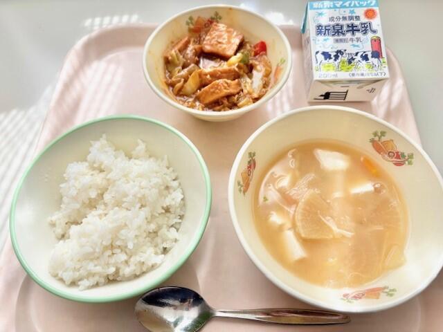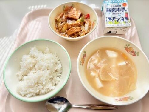 ごはん、回鍋肉、大根のみそ汁、牛乳