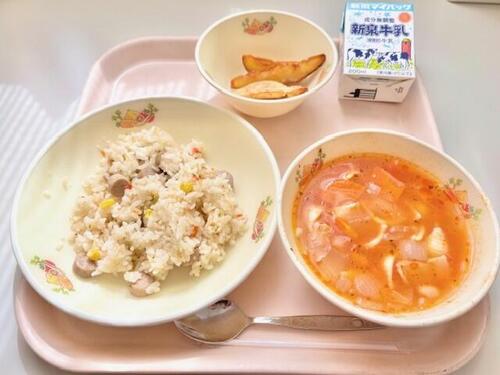 ピラフ、フライドポテト、ミネストローネ、牛乳