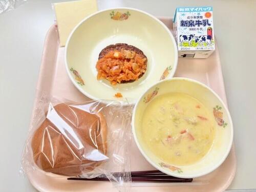 セルフハンバーガー、豆乳コーンチャウダー、牛乳
