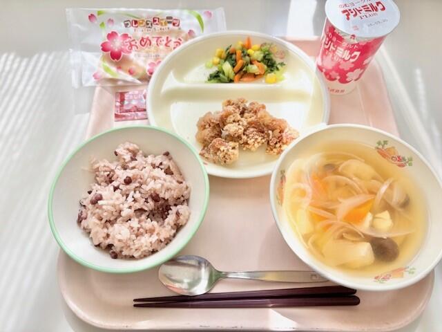 お赤飯と人気ナンバー1メニューのからあげ、春が旬の新玉ねぎなどを組み合わせました。