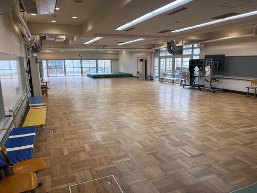 (学校の構造上、グラウンドの周囲が校舎に囲まれており、延焼があった時に校外に避難ができない可能性があることを想定し、小学部はプール側ホール、中学部・高等部は、体育館に避難した。今回は実施しなかったが延焼の可能性がある場合には小学部は正門より、中・高等部は裏門より校外へ避難を行う。)