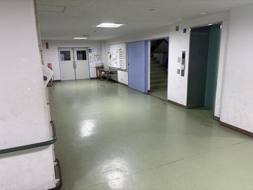 (強風注意報により、避難場所を当日に変更して実施。小学部はプール側ホール、中学部は運動場側ホール、高等部は給食室前通路と事務室前通路)