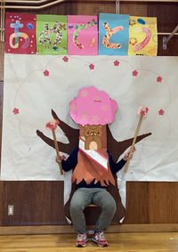 2,3年生による花道を通って、3年生が作成した桜の木に、名前を書いた花びらを貼っていき、すてきな桜の木を完成させました