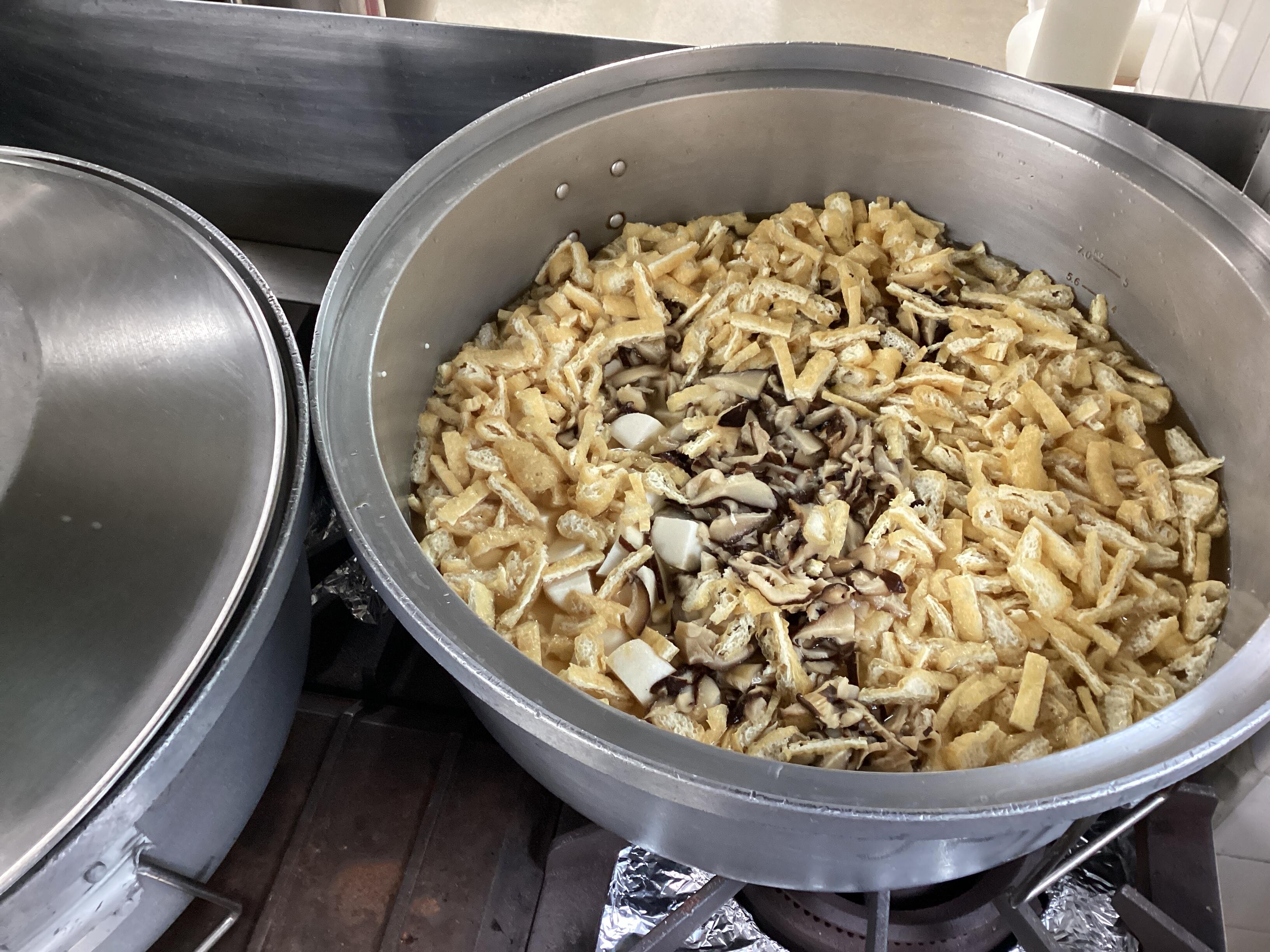 里芋は存在感が出るように大きめに切って、油あげと干し椎茸と一緒に炊飯します。