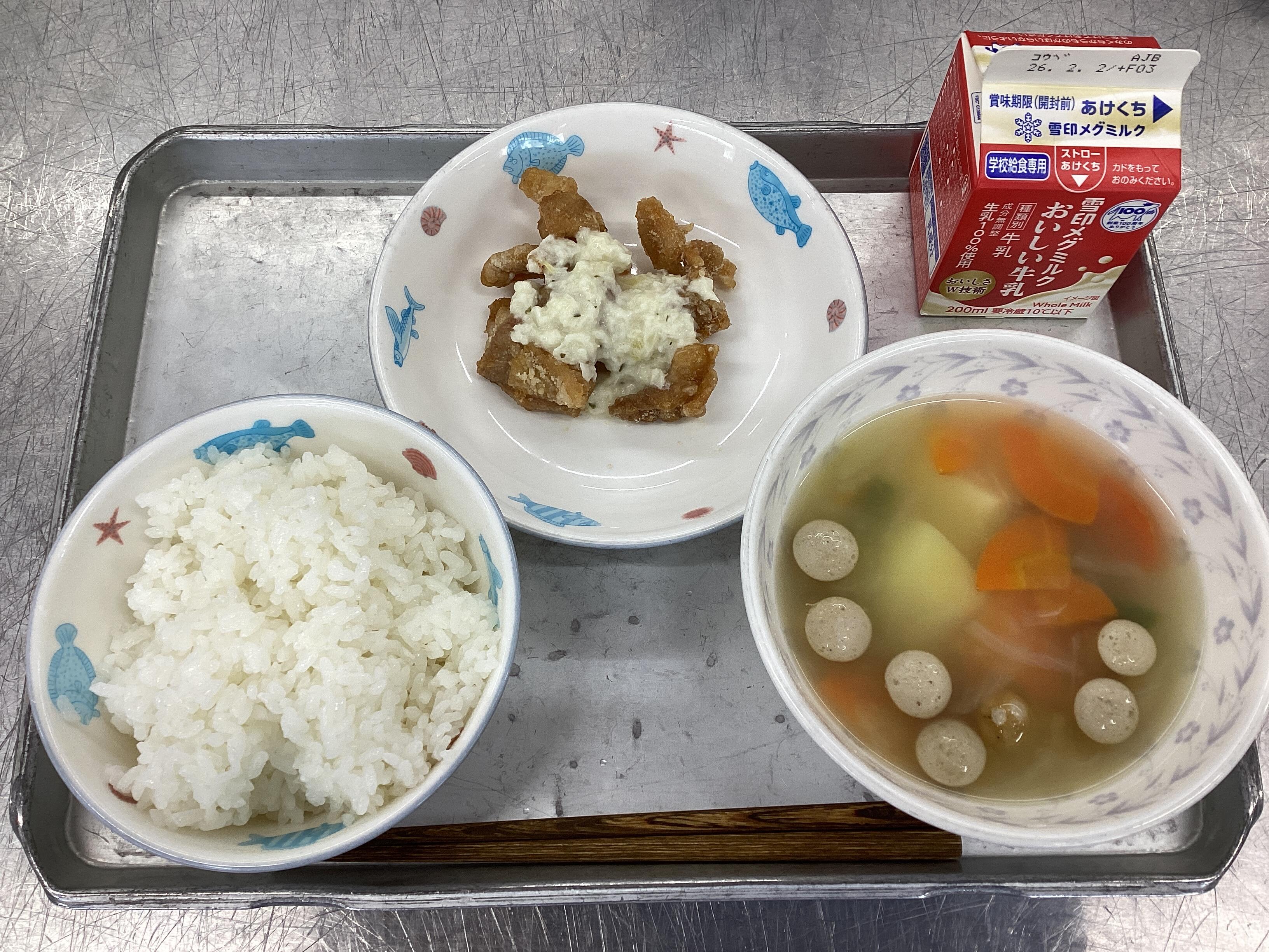 下味と衣をつけて揚げた鶏肉に甘酢をかけて提供し、タルタルソースは教室でかけてもらいました。