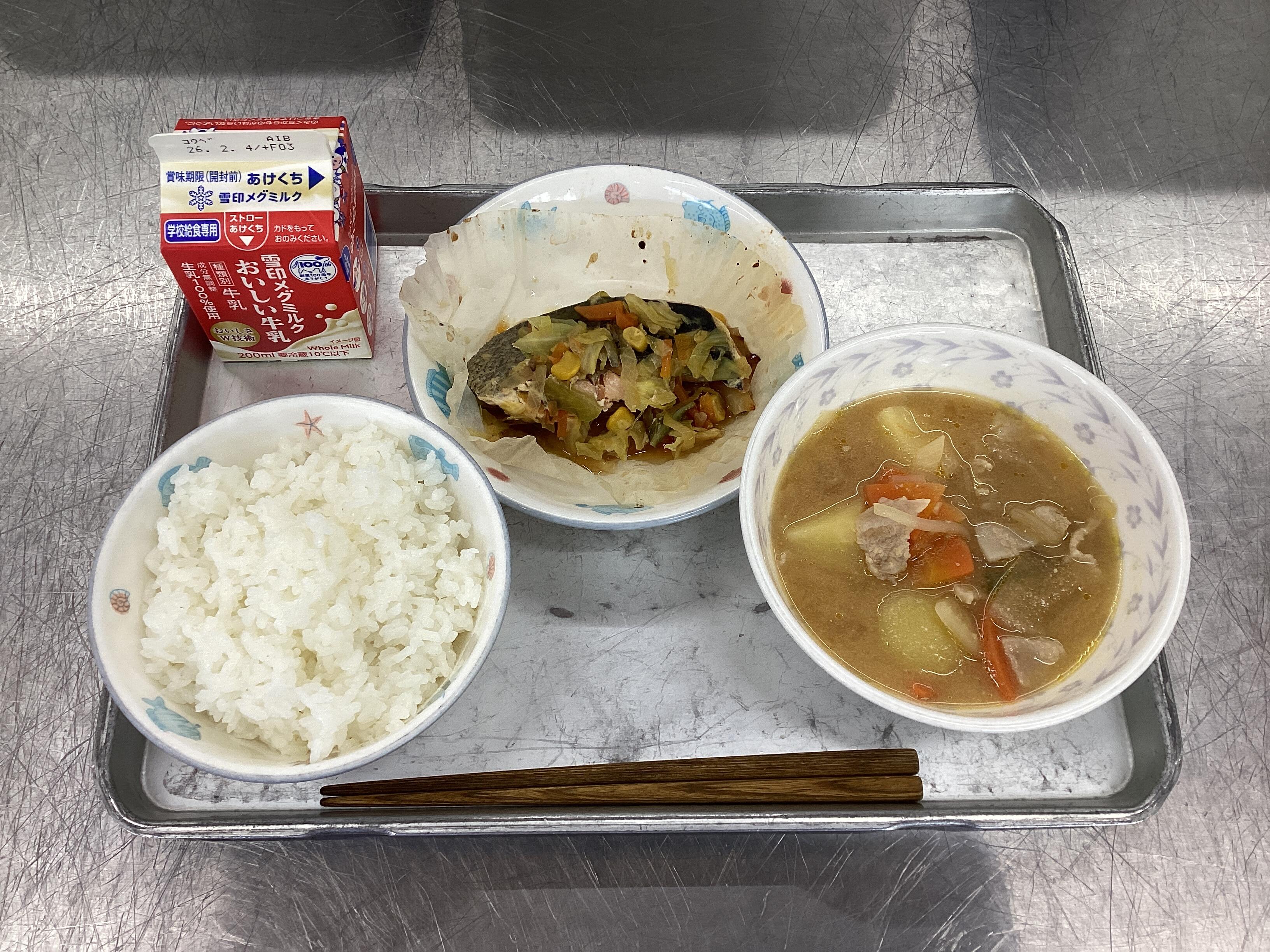 給食ではみそ味をつけた野菜を下に置いて、その上に鮭を置いて焼いて作ります。