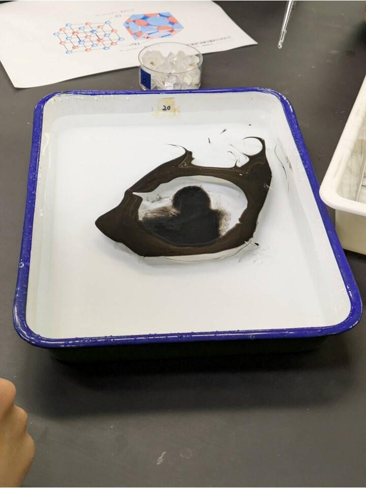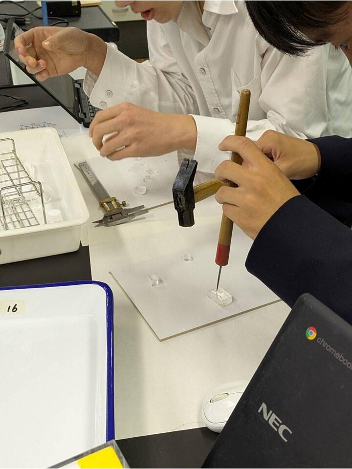 岩塩から塩化ナトリウムの結晶を削り取り、その体積や質量からアボガドロ定数を算出しました。イオン同士の反発により結晶は非常にきれいな直方体で削り取ることができるので、皆夢中になって作業に取り組んでいました。
