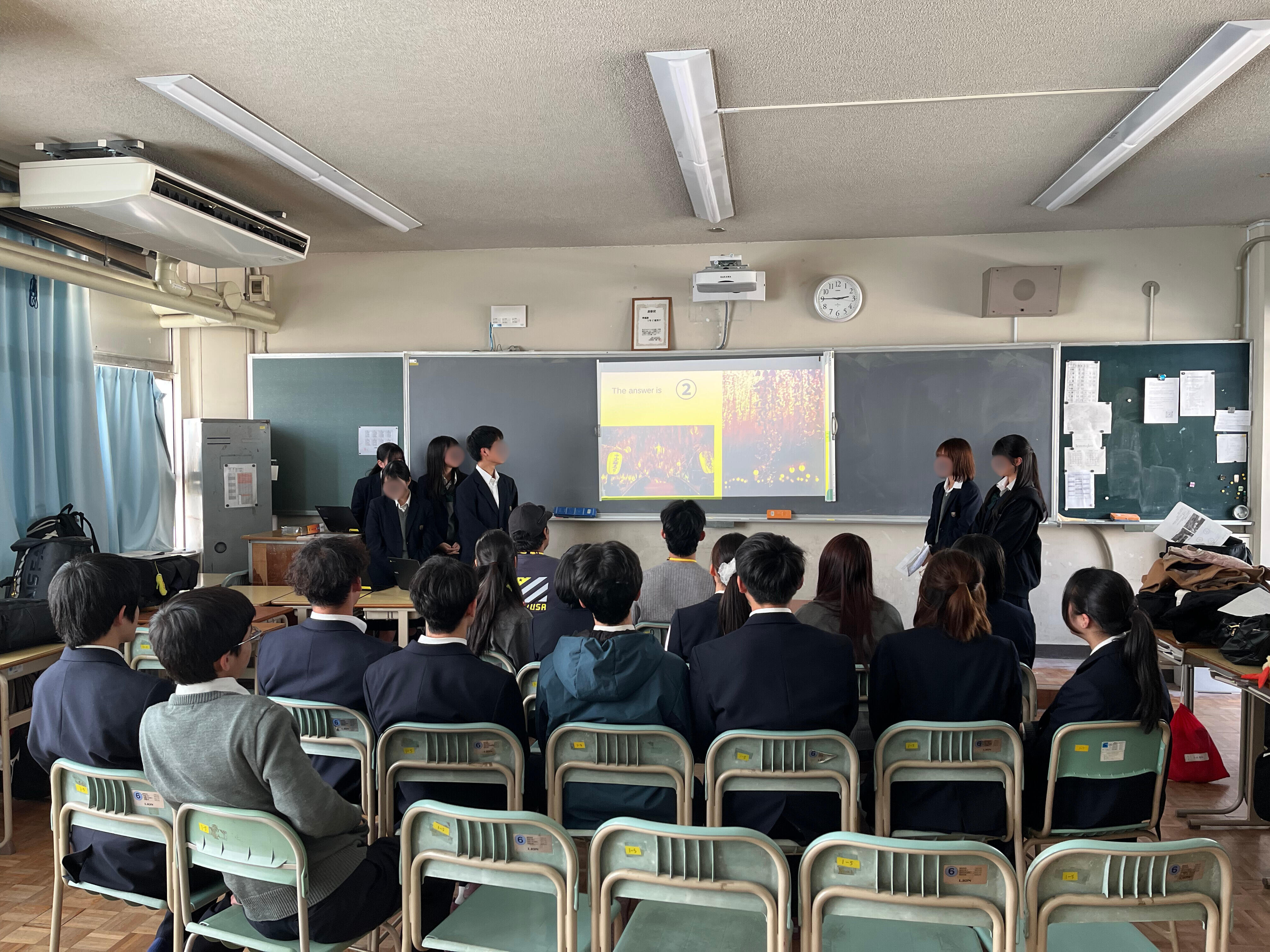 真剣に発表を聞き、鋭い質問を投げかける留学生に対し、生徒たちは圧倒されながらも懸命に英語で応答していました。