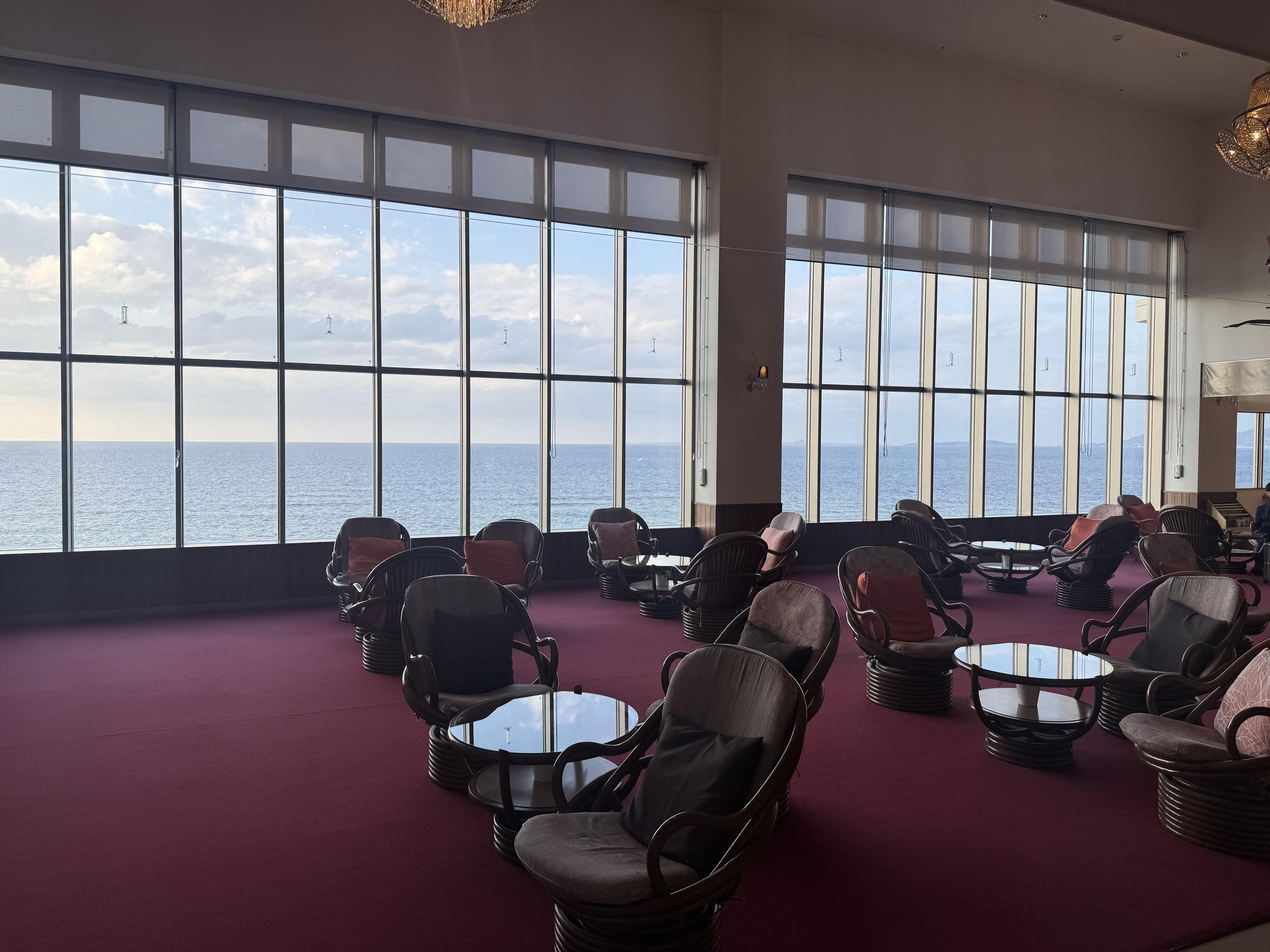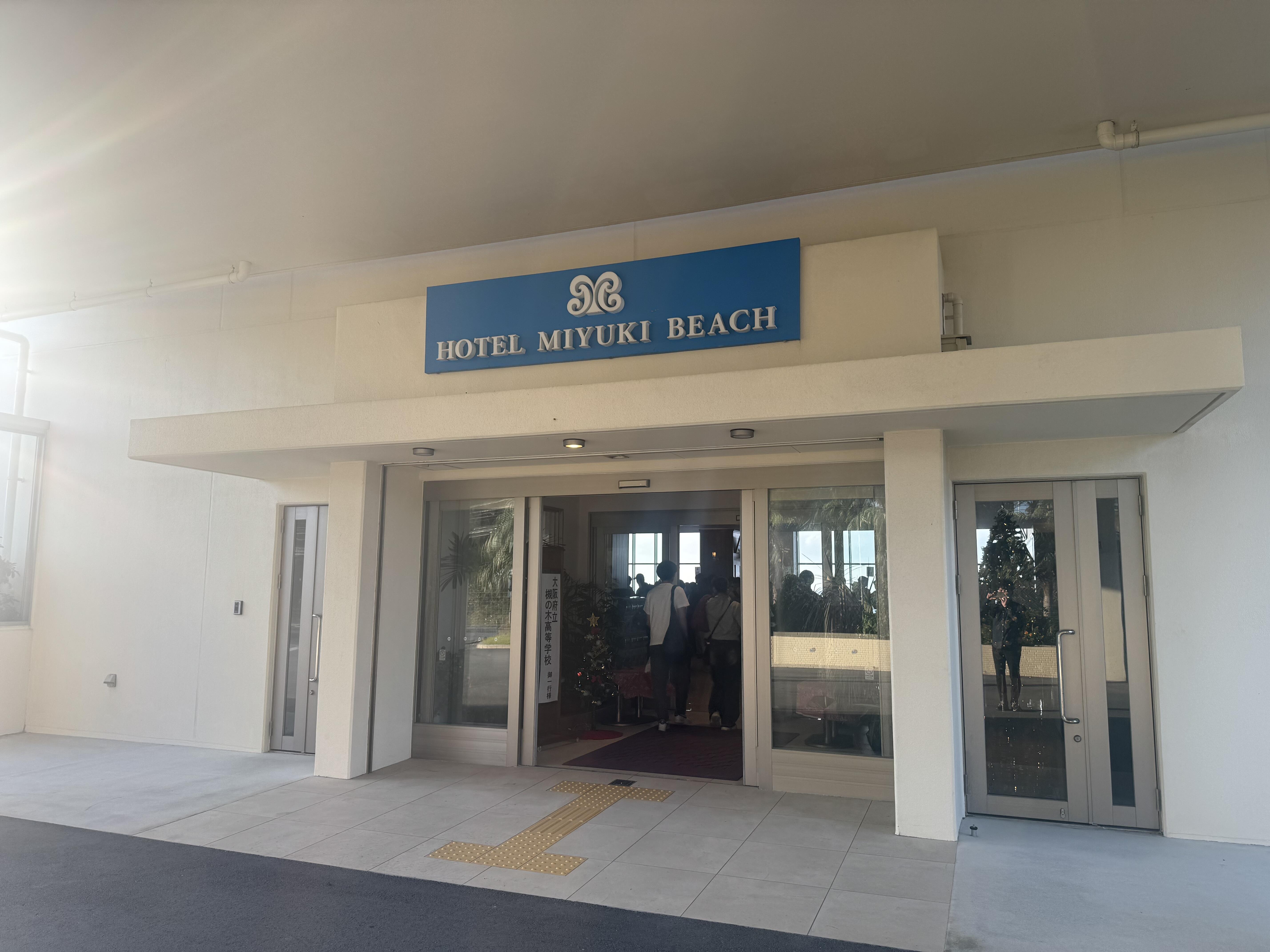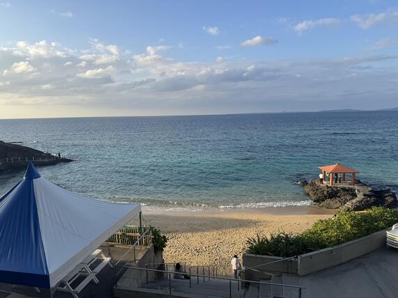 アメリカンビレッジでの散策を終え、本日の宿泊先、みゆきビーチに到着しました! ホテル目の前にはきれいなプライベートビーチがあり、室内もとても綺麗なホテルです!