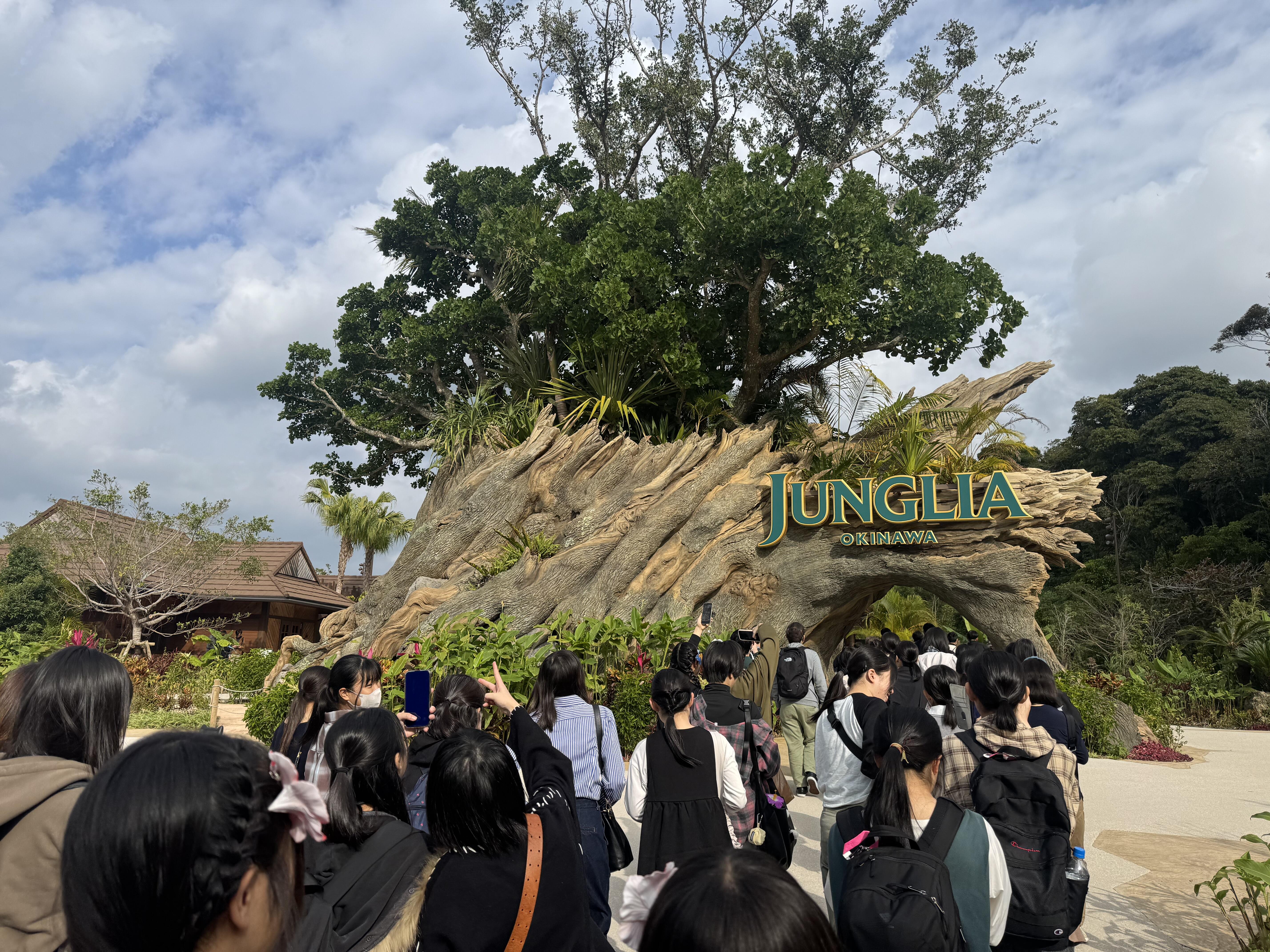 選択別体験、ジャングリア班です! ついにやってきました、話題の「ジャングリア」! 一歩足を踏み入れた瞬間、そこはもう日本じゃないみたいな別世界。生い茂る木々と、どこからか聞こえてくる野生の鳴き声に、全員、大興奮でした! 平日で空いていて、待ち時間も少なく、とても楽しんでいます!
