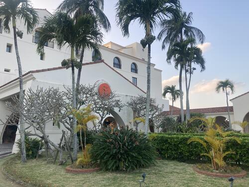 無事ホテルアリビラに到着しました。 それぞれのコース体験をやり切り、疲れが見えてきたバスの中でしたが、素敵なホテルの外観が見えたとき車内では歓声が上がっていました! 1日よろしくお願いします!
