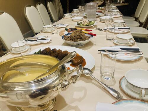 最後の夕食はホテルアリビラでいただきます。 デミグラスソースの贅沢ハンバーグなど、とても美味しそうな料理が並んでいますね!! 生徒たちの表情も明るく、とても素敵な夕食タイムです!