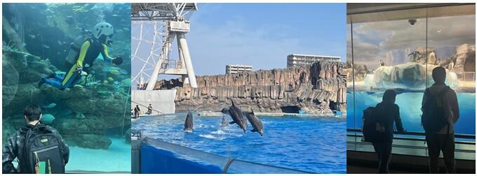 名古屋港水族館でたくさんの海の生き物を見ました。ダイバーさんと一緒に写真を撮りました。また、スタジアムでイルカパフォーマンスを見ました。大きなジャンプに歓声と拍手でした!