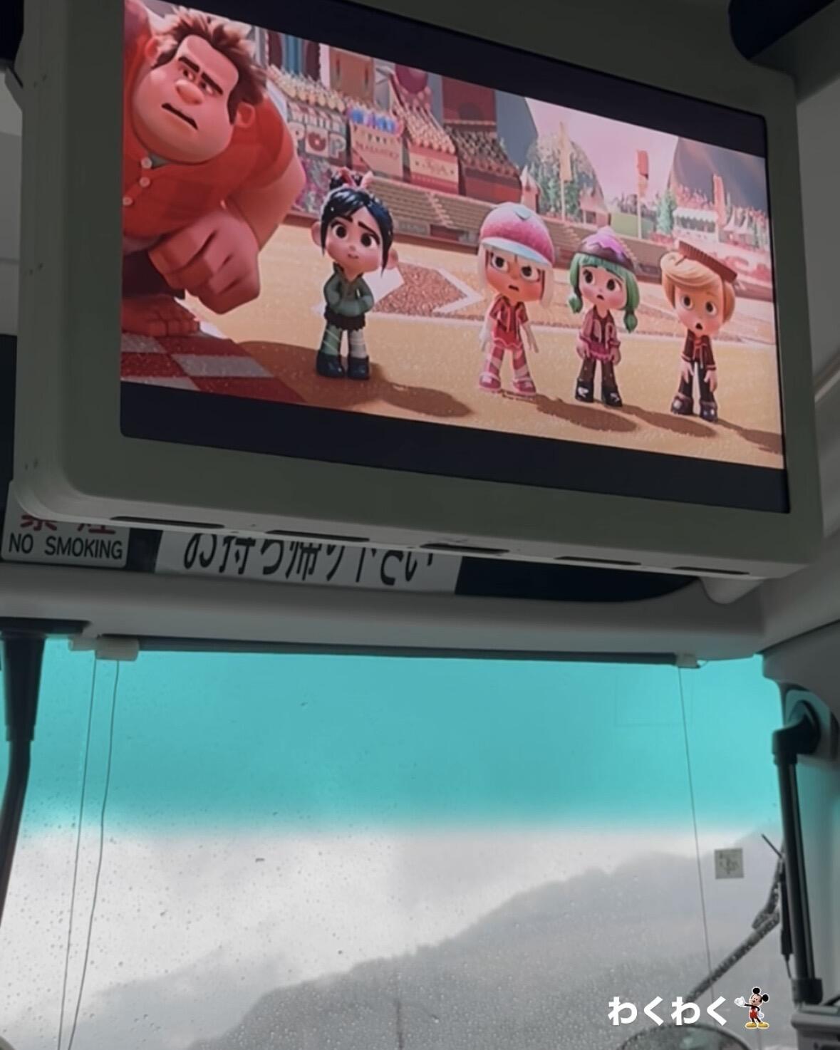 バス内ではシュガーラッシュを見てワクワク感を高めています🍬