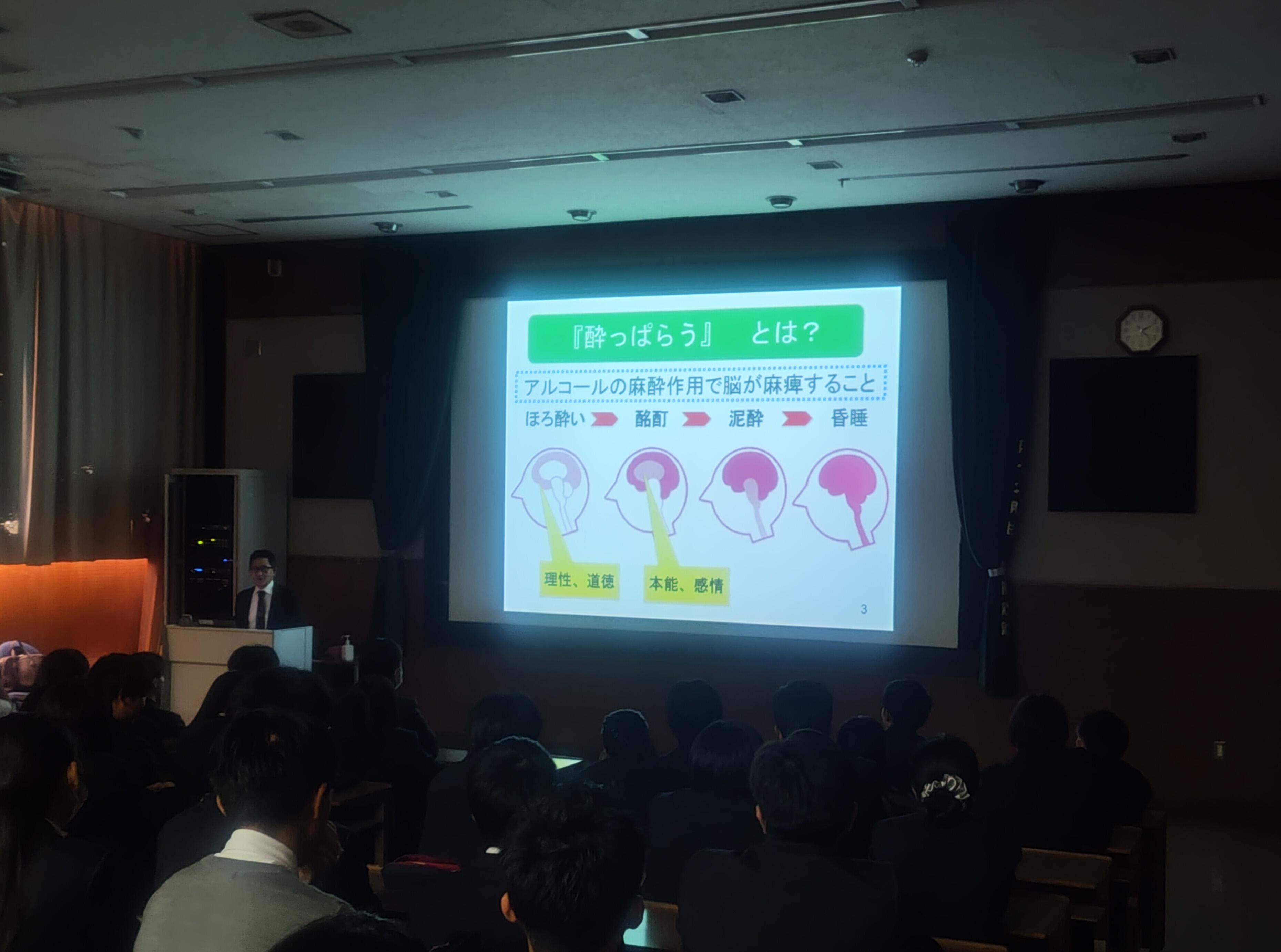 20歳未満の飲酒は法律で禁止されています。また肝臓をはじめとする臓器に障害を起こしやすくなり、アルコール依存症の危険性が高くなります。卒業後は今まで以上にアルコールが近い存在になるかと思います。今日の講演を思い出し、アルコールと上手に付き合う大人になってほしいと願っています。