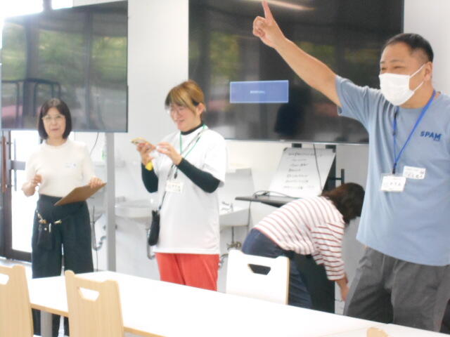 10月11日(土)1年生の進路説明会が終わってから、食堂でPTAの親睦行事を行いました。今年は、食堂の昼食体験と施設見学や授業体験などの、「1日高校生体験」を親睦行事として行いました。約30名を超える方々の参加があり、役員や教員ではない一般の方の参加が7名もありここ3年間で一番の人数でした。PTAの皆さんの地道な活動が実を結び、非常にうれしく思いました。受付をして、学校行事の動画を見ながら、食堂の人気メニューがたくさん詰まったオリジナル弁当をいただきました。