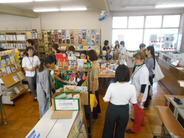 食事が終わったら、施設見学に動き出しました。まずは、興味津々のトレーニングルームです。いろいろ説明や、裏話しなどを混ぜながら話しているとあっという間に時間が経ちました。その後南館の2Fを通って、書道や美術室前の廊下をを見た後に、3Fの図書室を見学しました。たくさんの本に驚きながら、きれいに展示紹介してある本に感心されていました。そしていよいよ授業のために音楽室に向かいました。