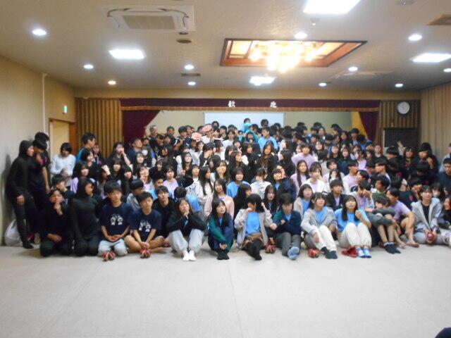 各クラブからの出し物が続く中、最後の最後に教員の寸劇が始まりました。最初は台本設定があったのですが、途中で何が何だかになってしまいましたが、先生方の収集力は強くきちんとしたまとまりになっていました。いつ練習したのか、ちゃんとやれるんですね。明日からはレクができる場所はありません。その分今日はたくさん楽しみました。出演した人、回した人、応援した人、頑張った人などなど、皆さんご苦労様でした。