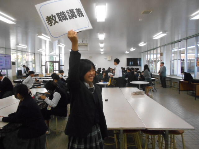11月1日(土)、午前中から普通に授業を行い、中学校の先生方を招いて、まずは授業見学をしてもらい、そのあとに中学校教職員向け学校説明会を開かせていただきました。同時に並行して、会議室で自立支援コースの学校説明会も行わせていただきました。その後午後から、中学生の皆さんに学校に来ていただき、体験授業を受けてもらいました。食堂を集合場所としましたが、中学生の皆さんが140名という人数になりました。英数国理社の授業をはじめ体育や情報さらに教職の授業まで用意していただきました。さらにそのあとには「クラブに行こう」でいろんな部活動の体験もありました。この日は1日中、学校内のどこかで学校説明会的なイベントが行われている1日でした。ハロウインが近かったので、この日の受付には着ぐるみのお菓子配布係りが登場しました。
