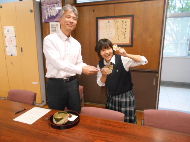 11月1日(土)茶道部の皆さんが校長室に来てくれました。今回は秋らしいお菓子を持ってきてくれました。「秋景色」と「栗きんとん」だそうです。とてもおいしくいただきました。茶道部は、活動が月1~2回程度なのか、でもその時にはみんなが集まって、師範の先生にお稽古をつけてもらっているようです。そういうクラブもいいですね。一度中学生とかと交流に外に出ていくのもいいですね。ちょうど、子ども園のハロインイベントのお菓子が残っていましたので、茶道部の生徒さんにもらってもらいました。この日は、校長室に「トリックオアトリート!」と入ってくる生徒さんも結構おられました。みなさんに、お菓子があげられてよかったです。