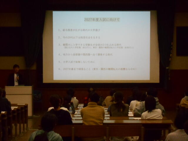 11月15日(土)、この日は朝から授業公開の日でした。1年~3年生の保護者の皆さんが、たくさん参加してくださいました。3時限目から行った2年生の進路説明会にも50名以上の方々が参加してくださいました。「大学入試に向けての心構え」という講演を聞かせてもらいました。校長挨拶の中でもお話ししましたが2年生の3学期は「3年生0学期」と考えて早くにスタートを切ることが大切です。ゴールが早くなってきているのに、スタートが遅ければ実質期間は短くなっているだけだと思いませんか?受験とか、進路選択とかいうのはやっぱり1年はかかるものだと思いますがどうでしょうか。最近、コスパとかタイパとかよく言われます。コスパとタイパの悪いものベスト2を「部活動」と「受験勉強」という人もいます。私はこの2つは確かに報われるのに時間がかかって、そして結果が約束されていないものだと思います。しかし、見返りや、達成感と経験値で考えるとこれほど効率のいいものはないと思います。まず、やり始めてください。みんな、応援してくれると思います。