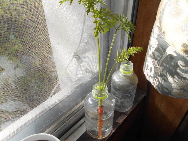 クリスタルの生徒さんの授業に行ってきました。プール前の農場の授業でした。秋に植え付けした、天王寺蕪と金時人参と玉ねぎの生育状況の確認と雑草抜きです。各畝にはイラスト入りの札が立てられていてわかりやすくなっています。「間違って小さな人参を抜いてしまいました。校長先生どうぞと言われたので、遠慮なくいただきました。校長室の窓辺で水耕栽培しています。