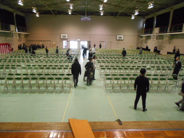 2月20日(金)クラブ員の1.2年生の皆さんが、試験が終わった後に、3年生の登校日の卒業式の練習のことを考えて体育館の会場をほとんど準備してくれました。ありがたいことですね。メジャーを当てて、椅子もまっすぐに並べてあります。何より紅白幕がいいですね。この紅白幕は八尾南高校のものでした。翠翔ではこれを八尾南が閉校になってから引き継いでずっと使っています。2月24日(火)練習・25日(水)予行・26日(木)卒業式本番と、ずっと椅子がある会場がすでに準備されているのがとてもありがたいことですね。3年生の皆さん、あと3日の高校生としての登校を大切な時間にしてください。2度と味わえない貴重な時間です。