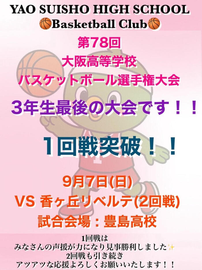 《大阪高等学校バスケットボール選手権大会》 会場・対戦校のお知らせ🔥 9月7日(日) 第1試合(9時30分頃〜)vs香ケ丘リベルテ高校 会場:豊島高校(最寄り駅 北大阪急行電鉄 箕面船場阪大前駅) みなさんの声援のおかげで1回戦突破しました! 3年生の悔いの残らない試合になるように2回戦も全力を尽くして頑張りますので、たくさんの応援よろしくお願いします❗️🏀