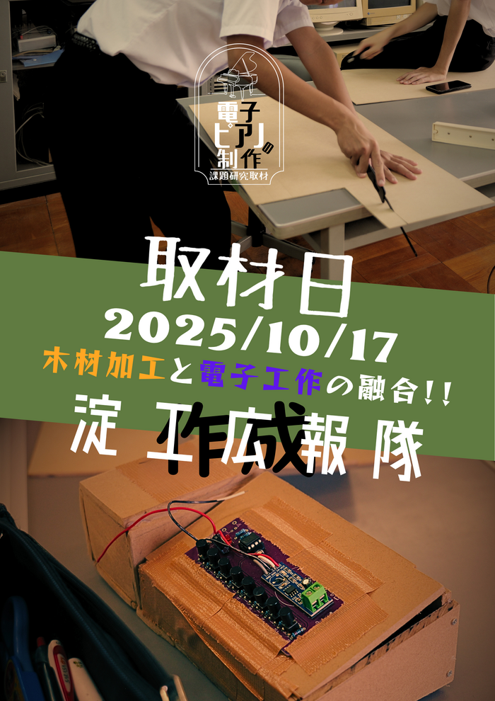 またまた淀工広報隊です!前回に引き続き、今回は「 電子ピアノの製作 」の取材をしてきました。この班では、電子ピアノを作り、演奏することを目標に課題研究を行っています。ピアノの基盤である模型を作る姿が撮影できました。のこぎりを使っており、かなりの力仕事に励んでいました!