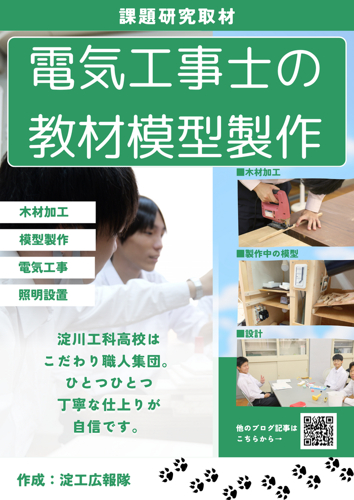 お久しぶりです!淀工広報隊です!今回は「 電気工事士の教材模型製作 」の課題研究班にお邪魔しました!住宅の模型を作り、それにあった照明を配線するというものらしく、今日は住宅の模型作りに取り組んでいました。作業は難しく、思うように進まないことも多いそうです。今日は担当の先生の名言は聞きそびれました。非常に残念です。ですが、その分生徒たちの頑張りを撮影できたため、よかったです!次回は、ついに私たちの課題研究を紹介します!!お楽しみに!
