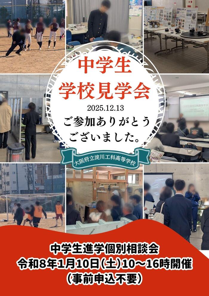 当日は多くの中学生・保護者の皆様にご参加いただき厚く御礼申しあげます。学校紹介および入試情報等をご説明させていただいた後、生徒会からは学校行事を、3年生協力生徒からは施設・設備等のご説明をさせていただきました。クラブ体験も中学生の皆様のご協力で無事に終了することができました。この機会が皆様の進路選択の一助になれば幸いです。淀工では、今後も1月10日(土)・2月14日(土)にて進学個別相談会を開催したします。事前申込は不要です。皆様のご参加を心よりお待ちしております。
