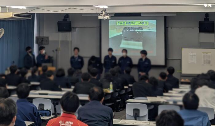 1月16日(金)より、機械系・電気系・メカトロニクス系・工学系の3年生では課題研究の発表会を開催しています。発表会では2年生も参加し、「ものづくり」を追求した各班の研究成果が示されました。本日はメカトロニクス系の「相撲ロボットの製作」や汎用機を駆使した「ものづくり」、そして昨年度より大会参加している「ミニ相撲ロボットの製作」など盛りだくさんの内容でした。2年生もこの発表会に参加することで、世代を超えた技術継承が実現できると考えています。さらに、2月には機械系・電気系・メカトロニクス系の3系合同班による「ものづくり」の校外発表も控えています。3年生の皆さんにとっては残りわずかな高校生活ですが、実りある発表会となるよう祈っております。