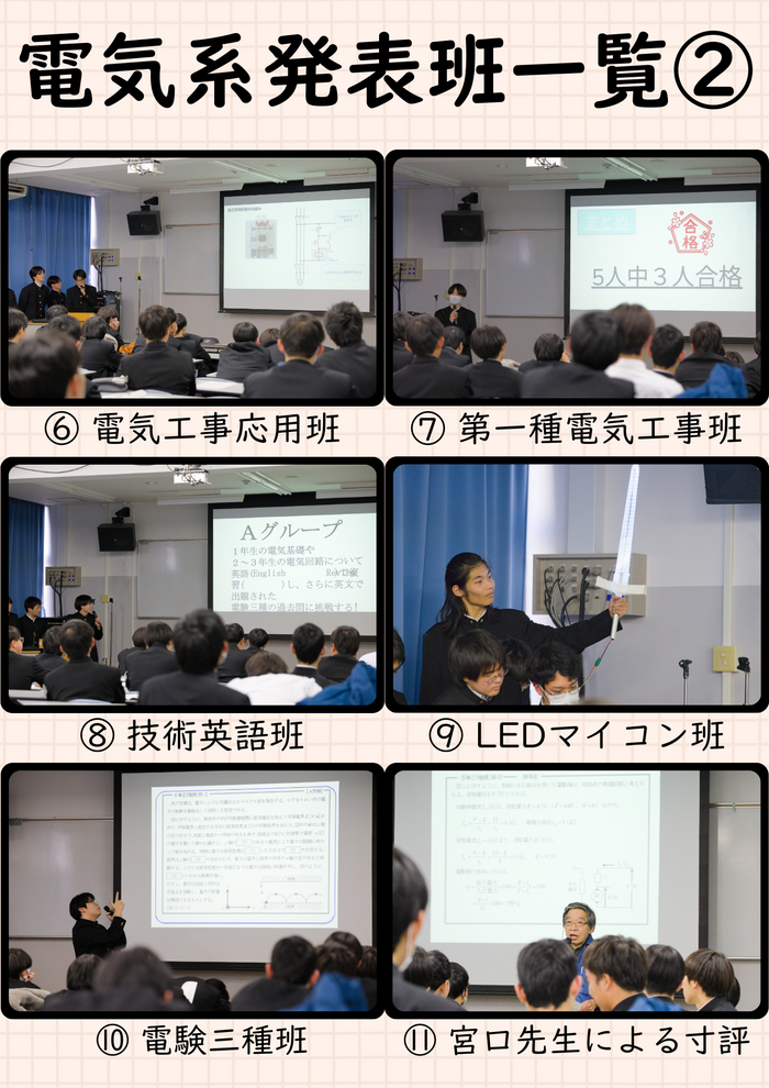 こんにちは。淀工広報隊です。今回は、「電気系課題研究 発表会」についての記事です。この発表会ではそれぞれの課題研究班が、取り組みの成果を他の班の生徒に向けて発表しました。実際にLEDの作品を持ち込む班や、制作した電子ピアノを演奏する班、中には電験三種の筆記問題を解説する班もあり、それぞれの特色がよく表れていました。各々の一年間の努力は伝わりましたが、教頭先生や宮口先生からユーモアを交えた寸評もあり、そこには常に向上心を持ち続ける姿勢こそが人間の本質だというメッセージが隠されていました。高校三年生の若々しさや喜怒哀楽が詰まった、良い発表会になりました。