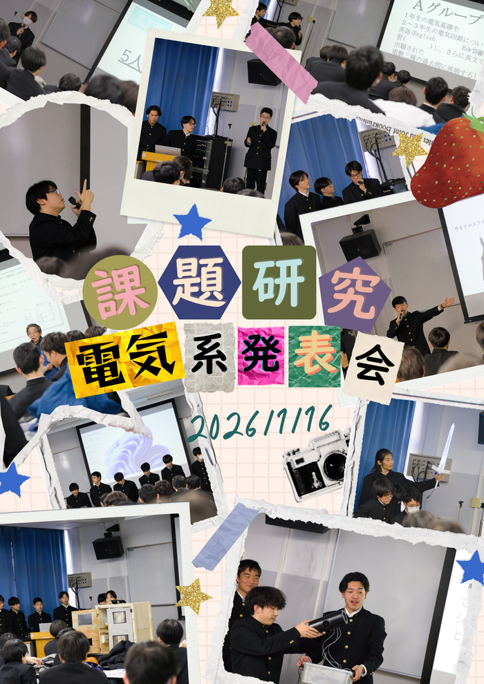 こんにちは。淀工広報隊です。今回は、「電気系課題研究 発表会」についての記事です。この発表会ではそれぞれの課題研究班が、取り組みの成果を他の班の生徒に向けて発表しました。実際にLEDの作品を持ち込む班や、制作した電子ピアノを演奏する班、中には電験三種の筆記問題を解説する班もあり、それぞれの特色がよく表れていました。各々の一年間の努力は伝わりましたが、教頭先生や宮口先生からユーモアを交えた寸評もあり、そこには常に向上心を持ち続ける姿勢こそが人間の本質だというメッセージが隠されていました。高校三年生の若々しさや喜怒哀楽が詰まった、良い発表会になりました。また、年度の終わりに伴い、R7年度の淀工広報隊が作成する記事もこれが最後になります。広報隊担当の先生は、「取材から編集まですべてを生徒に任せていたのですが、美しい写真や動画でわかりやすく印象的な記事にしてくれていたので、卒業生や保護者の方々、中...