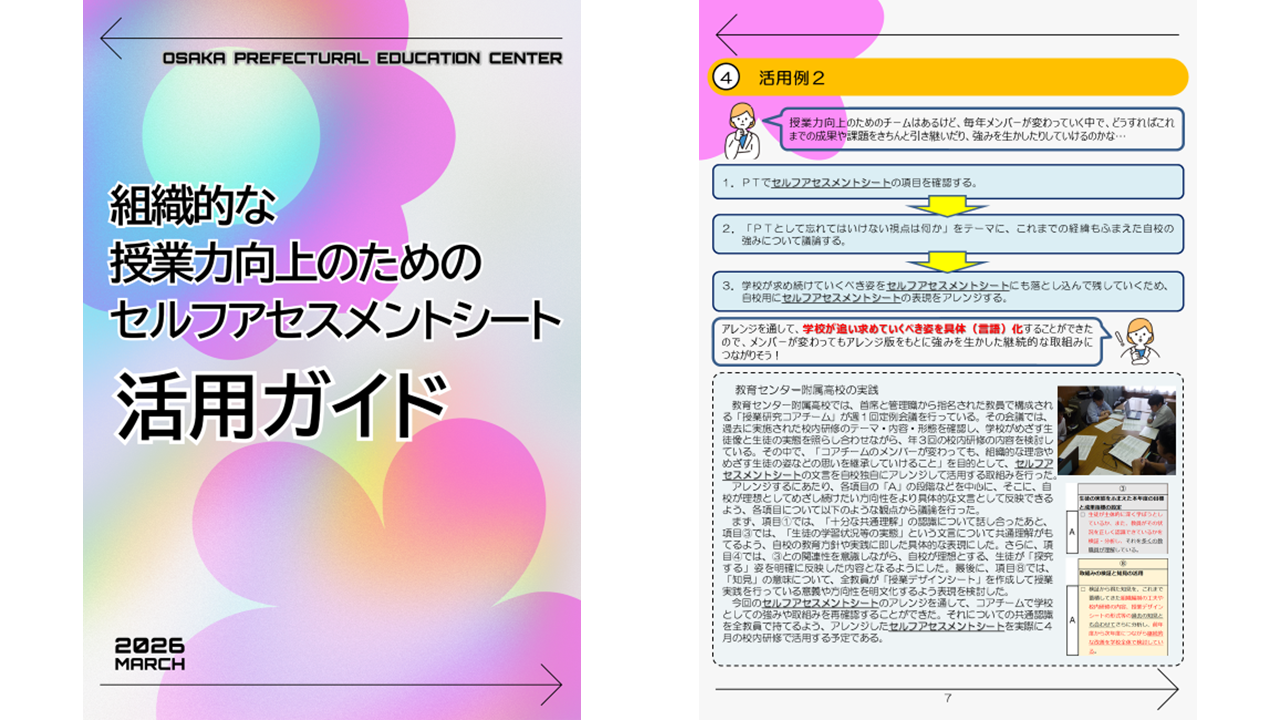 組織的な授業力向上のためのセルフアセスメントシートの見方や、実際にセルフアセスメントシートを活用した府立高等学校における実践事例などを掲載しています。