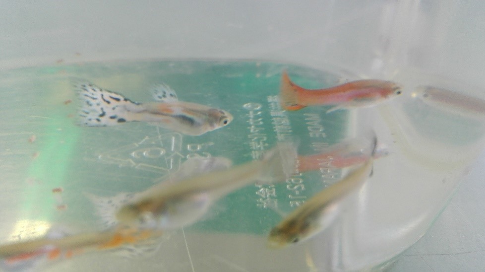 4月末に2年生女子部員が中心となって、グッピーの♂3尾♀5尾をペットショップより購入し、飼育し始めました。